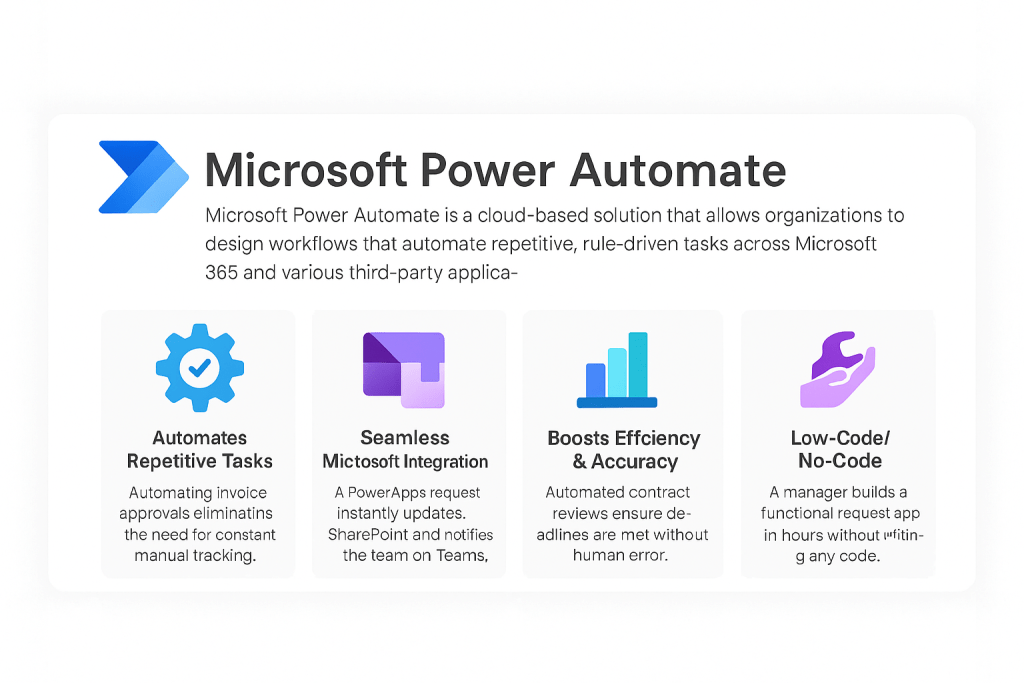 Power Automate eliminates repetitive tasks by automating them. From sending reminders to managing approvals, it saves hours daily.